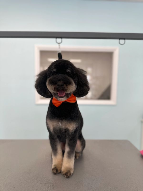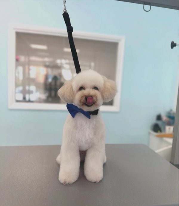 Bath and blow dry, head to tail haircut, nails clipped, ears cleaned.
